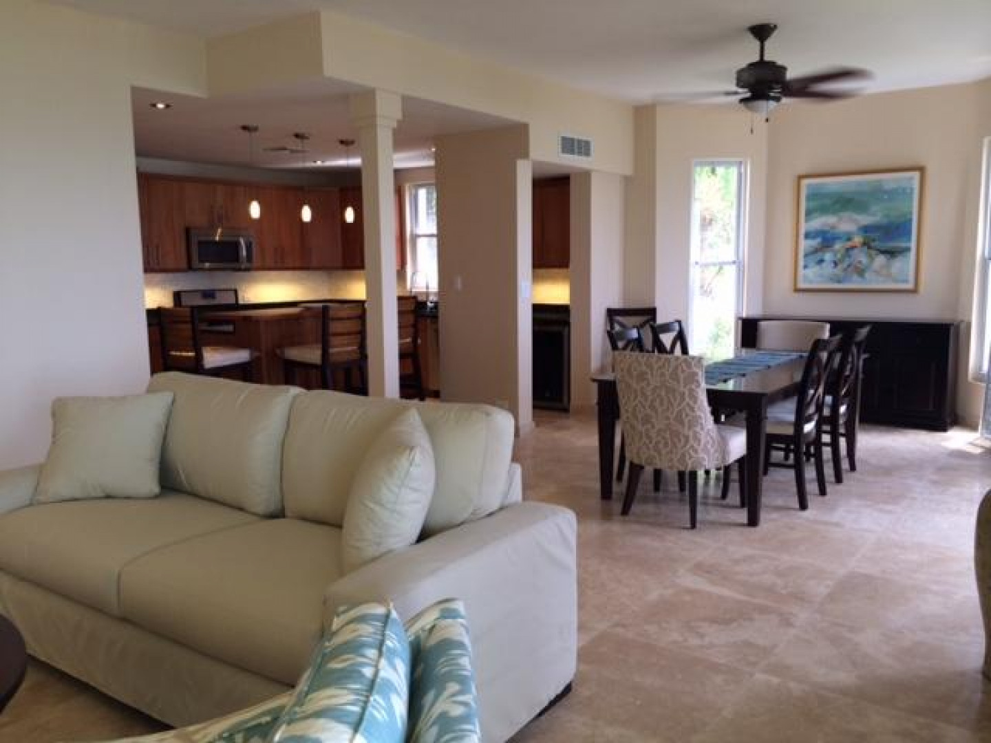 Completely renovated two bedroom two and one half bath condo with amazing harbor views. Custom mahogany cabinetry, travertine floors, granite counter tops and all new stainless steel appliances. Gated, fully furnished, turnkey. Pets allowed with approval. Rental rate includes Dish and Internet. Tenant pays WAPA and water.