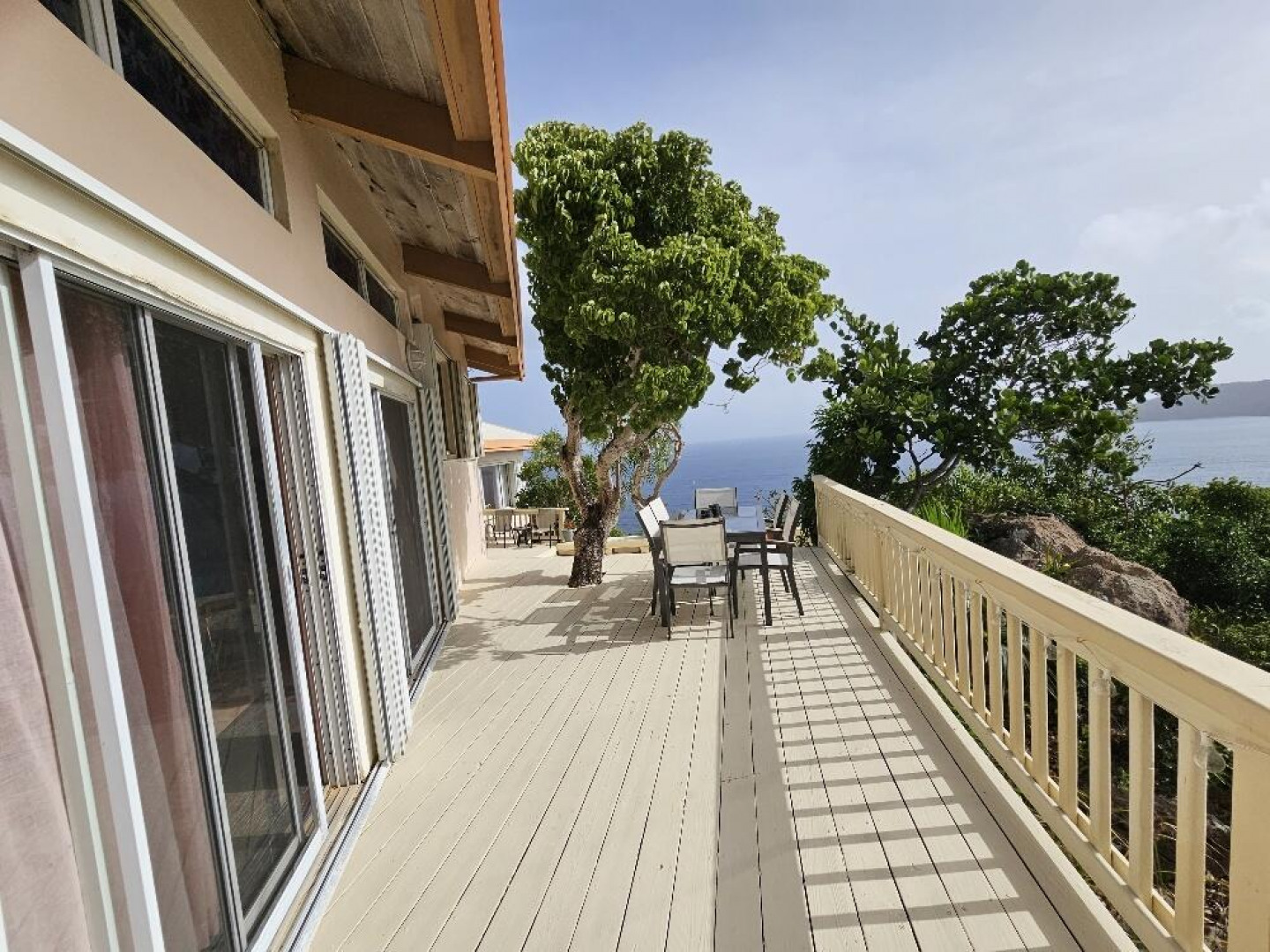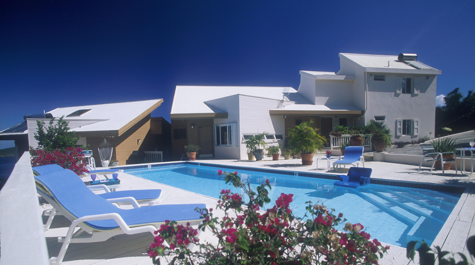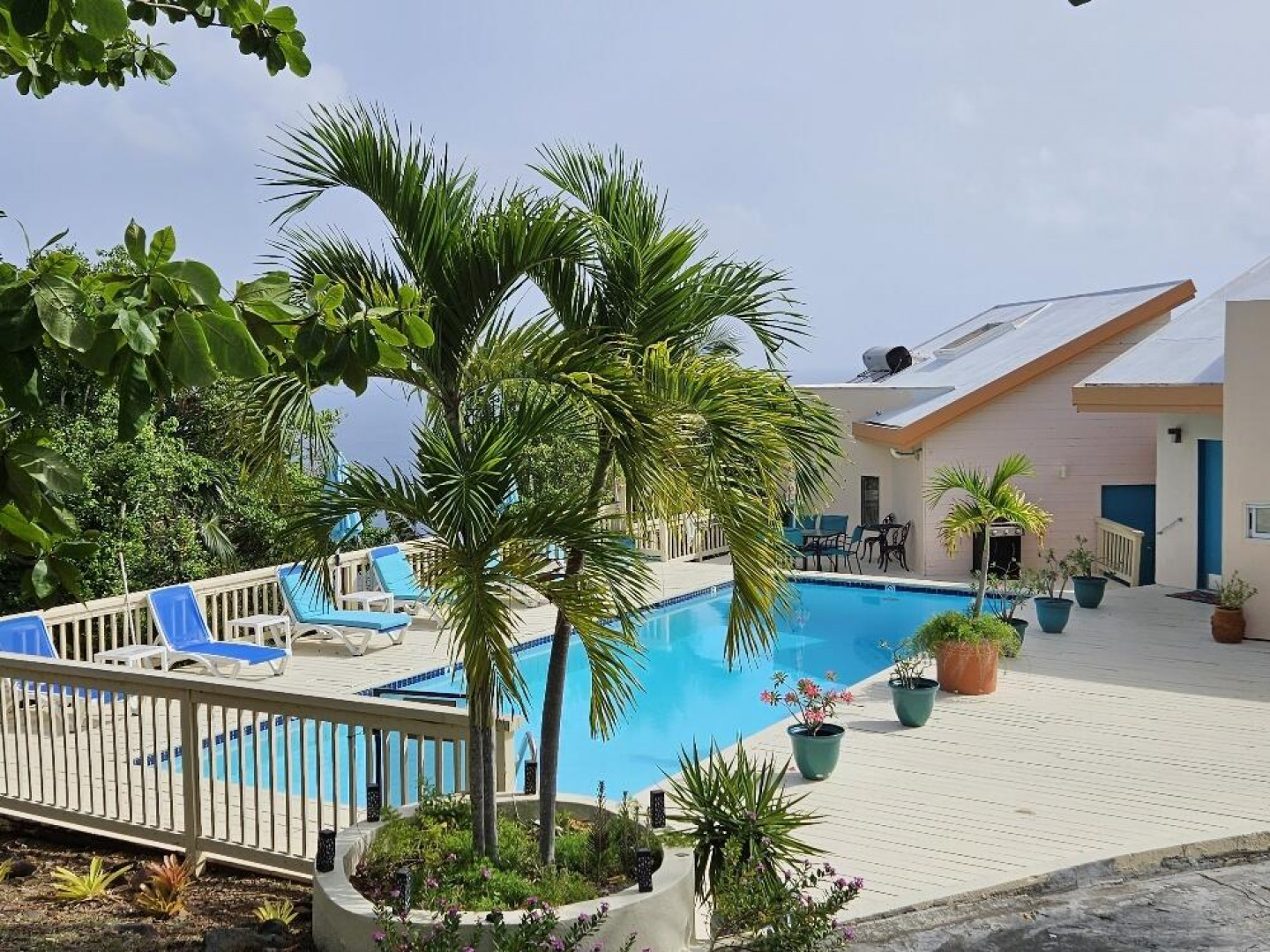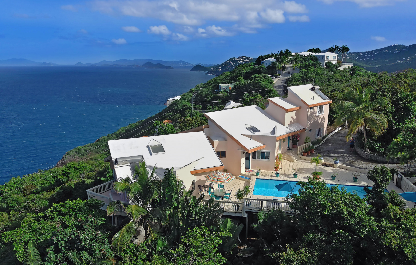 FAIRWINDS VILLA is perfectly situated on a large parcel of beautiful land totaling 1.124 acres with spectacular epic views of US islands and cays and British islands and even parts of Magen's Bay. Currently used as a second home and vacation rental, this 3 bedrooms, 3 1/2 baths villa is a great primary residence too. The 40' X 12' inground pool is surrounded by sun and shade decking and the grounds are tropically planted. Very private location within the gated D'Antilles Peterborg community. Standby generator w/ auto transfer, native stone walls, circular driveway and lots of parking. Lots of room for expansion and ability to build separate cottages for a family compound.